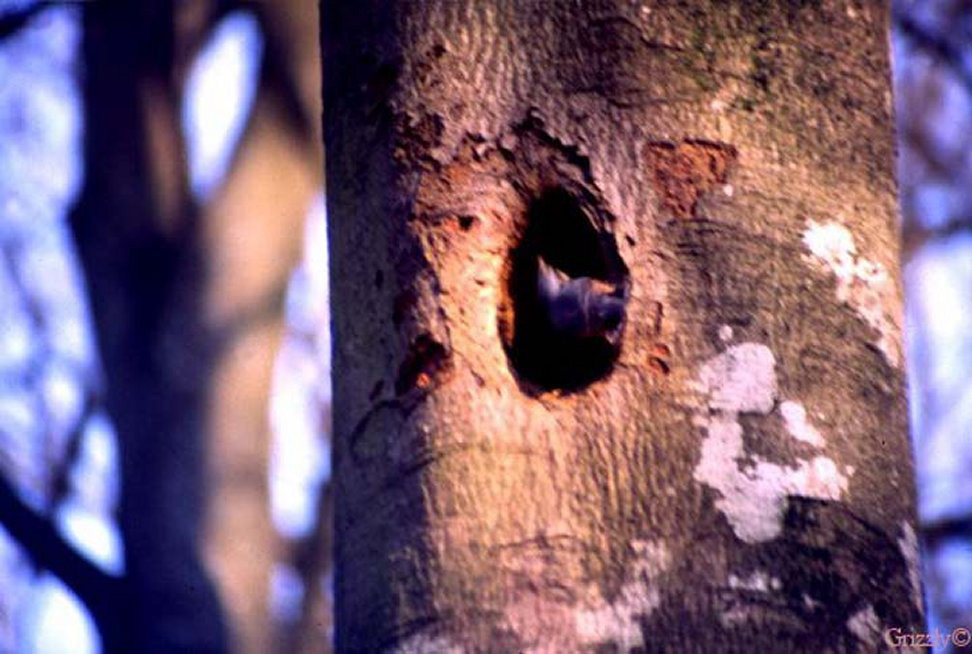 Sittelle torchepot adaptant l'entrée de la loge d'un pic noir a sa taille à l'aide de boue et feuilles d'arbre.