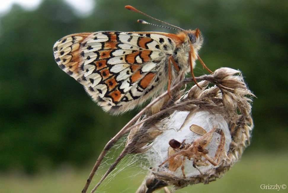 Epeire diadème,Nid et une Mélitée du plantain,Le damier qui va se faire capturer