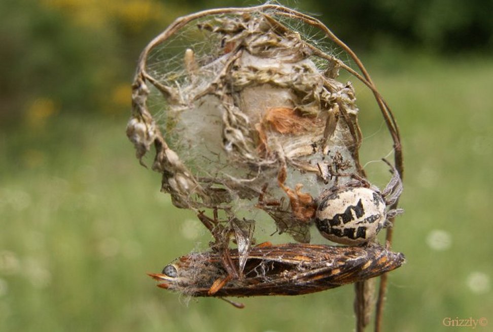 Epeire diadème,Nid et une Mélitée du plantain,Le damier qui c'est fait capturer et ce qu'il en reste.